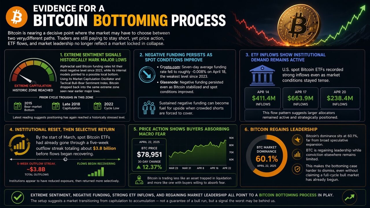 If that process continues while funding stays negative or only gradually normalizes, the short side becomes more vulnerable to a squeeze than the current mood implies. That is the strongest version of the bottoming case, and it does not require declaring that a full-cycle bull market has already begun.