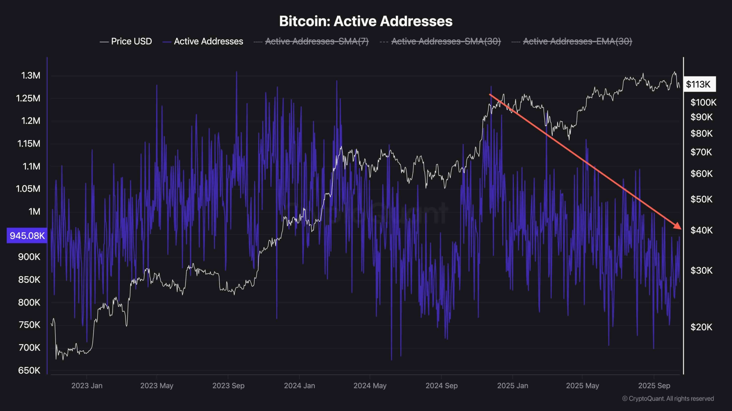 Bitcoin Active Addresses offers an important signal about market participation and network health. Over recent months, the number of active addresses has gradually declined, even as Bitcoin’s price maintained its position near record highs. Historically, such a decline in on-chain activity often reflects market fatigue or short-term distribution, particularly following extended rallies.