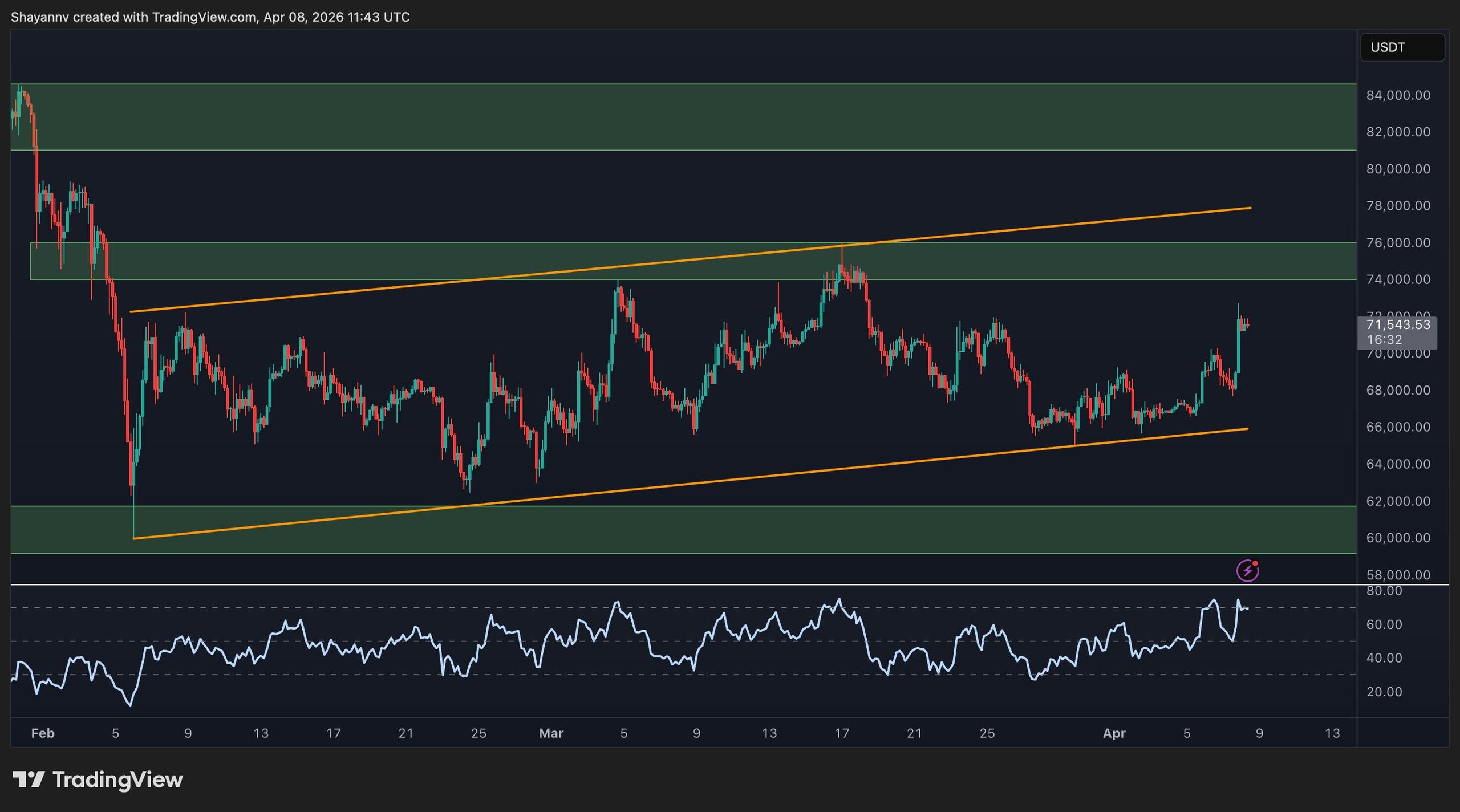 On the 4‑hour chart, Bitcoin remains range‑bound within an ascending channel, with a lower boundary near $66k and an upper boundary near $78k. The price has recently tested the lower boundary and rebounded. The internal trend shows short‑term higher highs over the recent sessions, indicating a move toward the $75k horizontal resistance level.