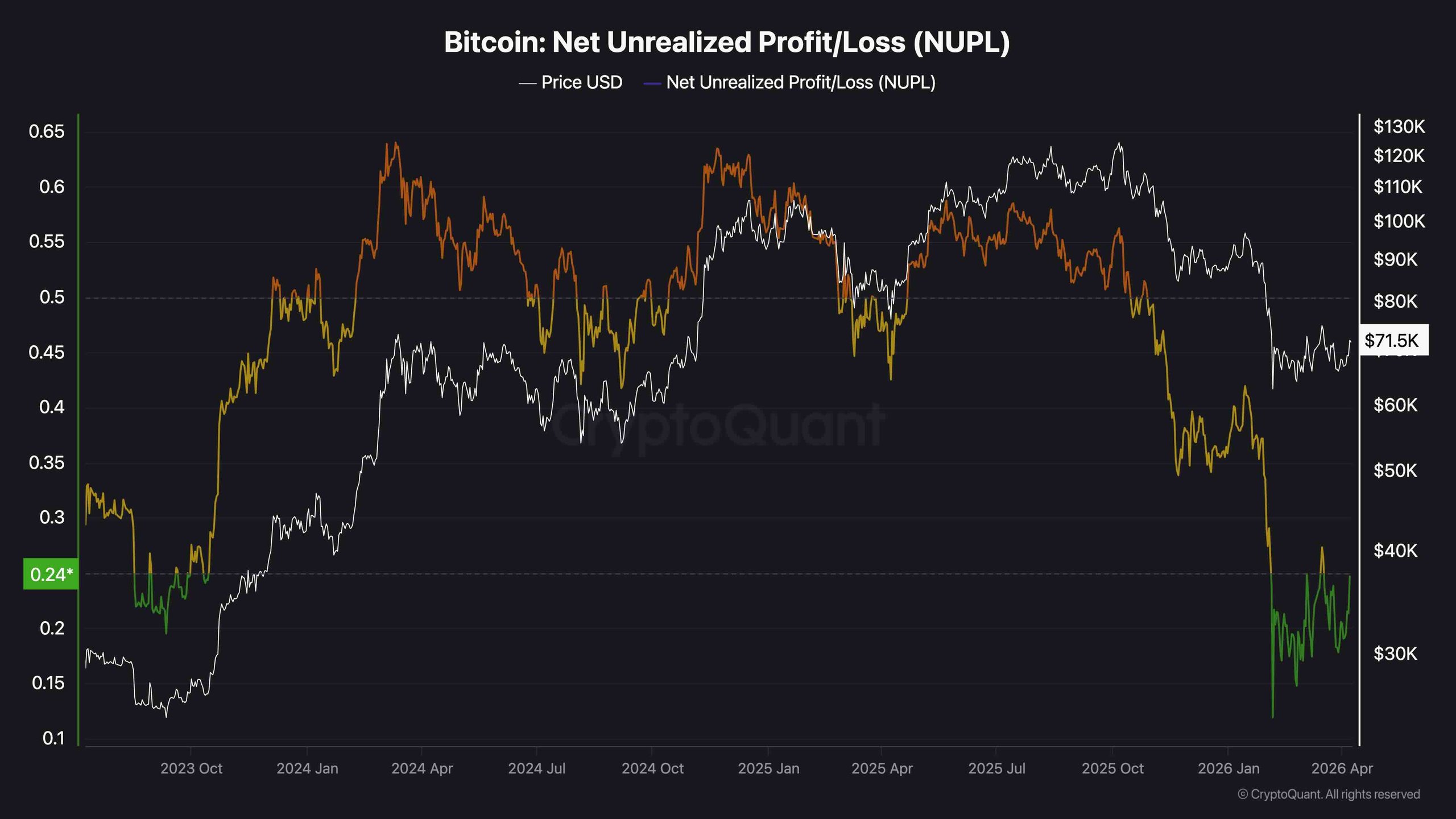 From an on-chain perspective, the Net Unrealized Profit/Loss (NUPL) metric sits in a low profit‑share zone similar to levels seen during prior major accumulation phases, suggesting many holders are not realizing significant gains. This often points to a cautious market that has absorbed more of the previous downturn without renewed speculative excess.